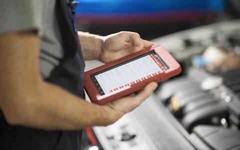 Kfz-Mechaniker-verwendet-Tablet-fuer-Fahrzeugdiagnose-in-der-Werkstatt-480x30...